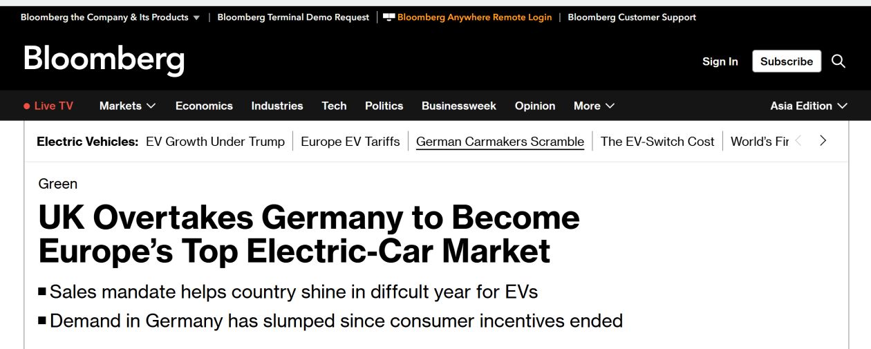 2024年英国超越德国成为欧洲最大的纯电动汽车市场