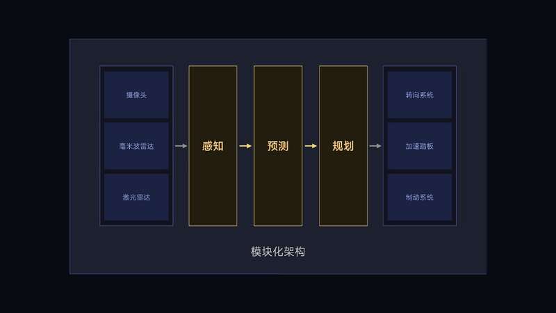 此前的模块化架构是多步骤规则式,感知摄像头/激光雷达/毫米波雷达在获取到信息后,将信息提供给决策平台,决策平台依据系统设置的规则来预测并规划,最后由控制系统去执行。由于感知、规划及执行系统相对独立,且每个步骤都要占用一定的计算时间,整体系统的响应较慢,延时较高。