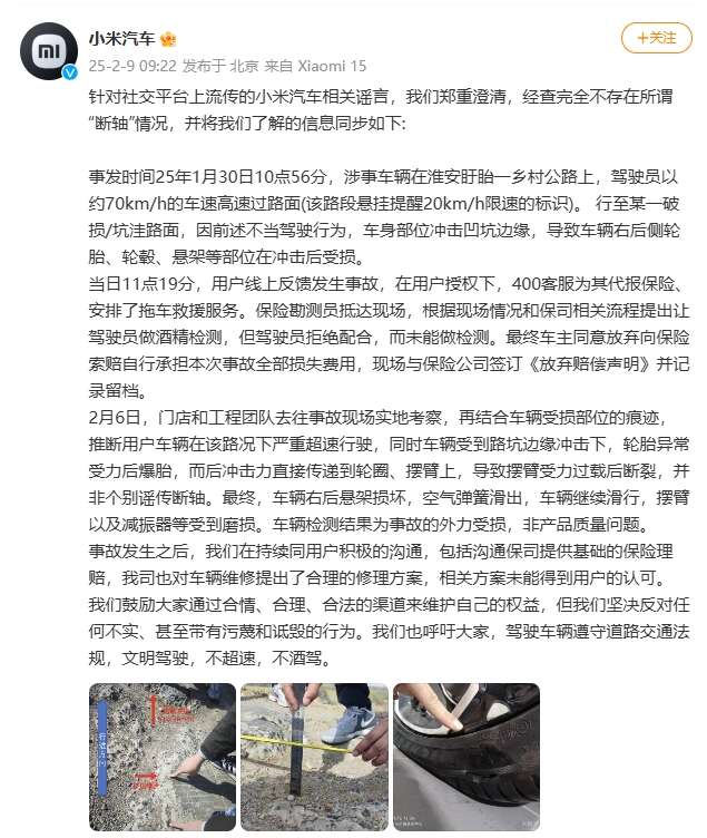 2月9日,小米汽车发布声明表示,针对社交平台上流传的小米汽车相关谣言,郑重澄清,经查完全不存在所谓“断轴”情况,并同步相关信息。
