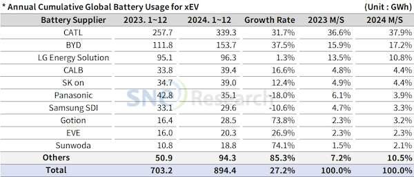 韩、日企2024年市场的丢失与欧美汽车厂商对动力电池的需求下降有关。