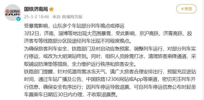 央视网消息:据@国铁济南局 微博消息,3月2日,济南、淄博等地出现大范围暴雪,受此影响,京沪高铁、济青高铁、胶济客专等线路部分区段途经列车出现不同程度晚点。