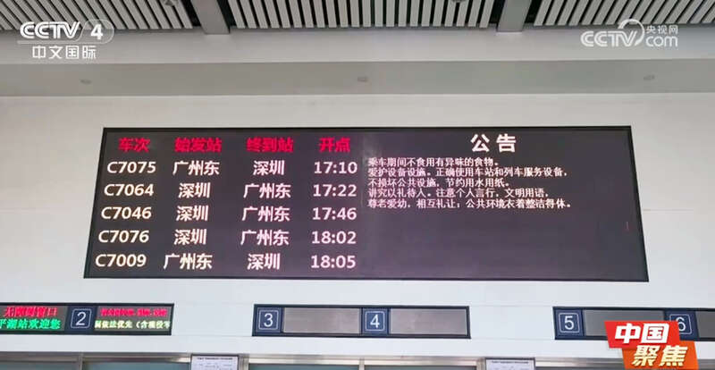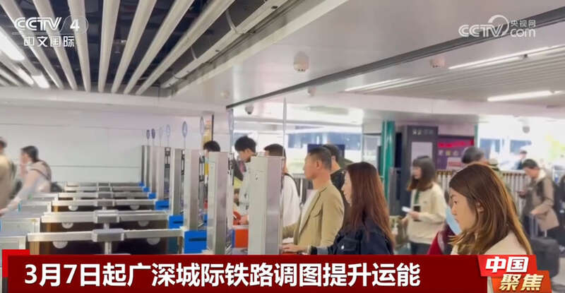 央视网消息:记者从国铁广州局了解到,自3月7日起,广深城际铁路将实施新的列车运行图,通过加密班次、优化时刻等措施,进一步满足粤港澳大湾区旅客出行需求,助力打造“一小时生活圈”。