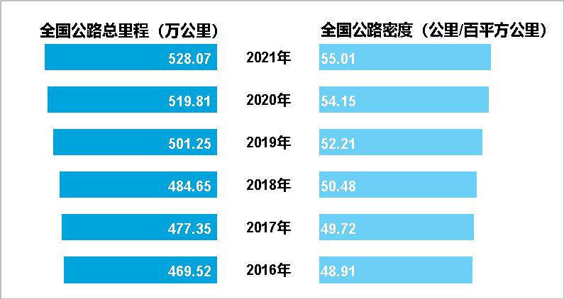 年末全国公路总里程528.07万公里,比上年末增加8.26万公里。公路密度55.01公里/百平方公里,增加0.86公里/百平方公里。公路养护里程525.16万公里,占公路总里程比重为99.4%。