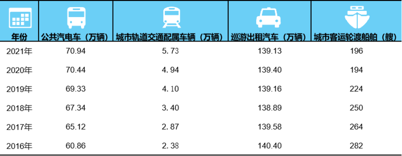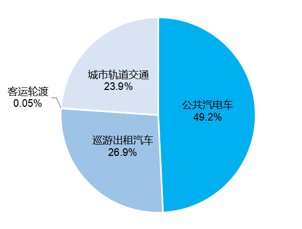 年末全国拥有城市公共汽电车70.94万辆,比上年末增长0.7%,其中纯电动车41.95万辆、增长10.8%,占整个城市公共汽电车比重为59.1%、提高5.4个百分点。拥有城市轨道交通配属车辆5.73万辆,增长15.9%。拥有巡游出租汽车139.13万辆,下降0.2%。拥有城市客运轮渡船舶196艘,增长1.0%。