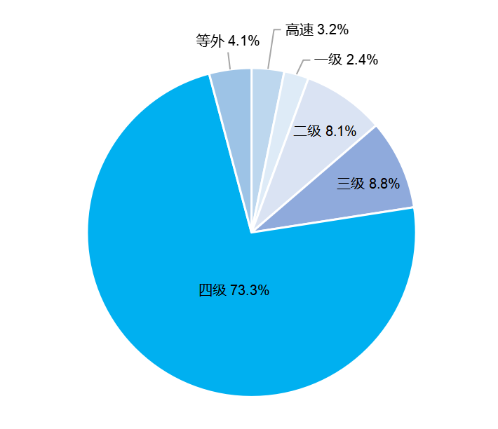 年末全国四级及以上等级公路里程506.19万公里,比上年末增加11.74万公里,占公路总里程比重为95.9%、提高0.7个百分点。其中,二级及以上等级公路里程72.36万公里、增加2.13万公里,占公路总里程比重为13.7%、提高0.2个百分点;高速公路里程16.91万公里、增加0.81万公里,国家高速公路里程11.70万公里、增加0.40万公里。
