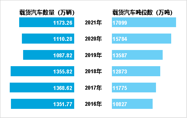 年末全国拥有公路营运汽车1231.96万辆,比上年末增长5.2%。分结构看,拥有载客汽车58.70万辆、1751.03万客位,分别下降4.2%和4.9%;拥有载货汽车1173.26万辆、17099.50万吨位,分别增长5.7%和8.3%,其中,普通货车406.94万辆、4923.43万吨位,分别下降1.7%和增长5.6%,专用货车60.39万辆、718.76万吨位,分别增长19.2%和20.5%,牵引车346.68万辆、增长11.5%,挂车359.25万辆、增长7.4%。