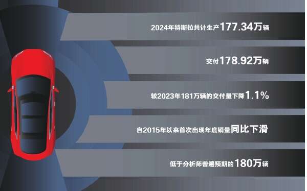 当地时间1月2日,特斯拉公布的最新数据显示,2024年全年,特斯拉共计生产177.34万辆,交付178.92万辆,较2023年181万辆的交付量下降1.1%。这是特斯拉自2015年以来首次出现年度销量同比下滑,也低于分析师普遍预期的180万辆。马斯克此前曾在财报会议上表示,特斯拉2024年销量将略高于2023年,实现“小幅增长”。