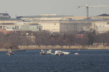 美东时间1月29日晚,华盛顿里根国家机场附近一架载有64人的客机与载有3名美军士兵的“黑鹰”直升机相撞后坠河,事故共造成67人遇难。(央视记者 许骁)