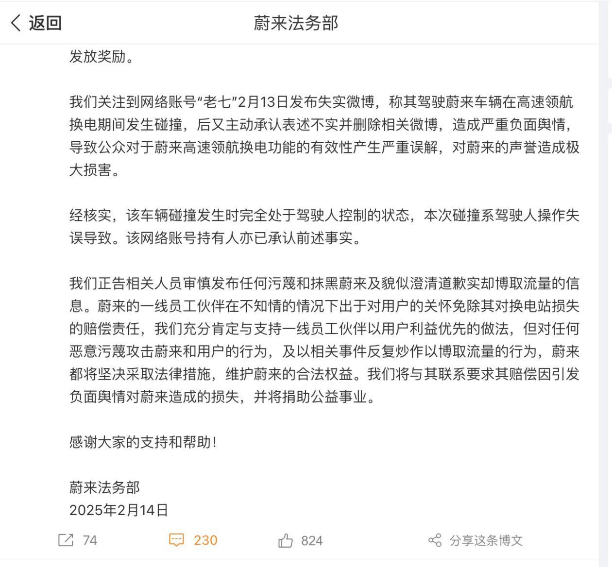 2月14日晚间,蔚来法务部发文称,关注到网络账号“老七”2月13日发布失实微博,称其驾驶蔚来车辆在高速领航换电期间发生碰撞,后又主动承认表述不实并删除相关微博,造成严重负面舆情,导致公众对于蔚来高速领航换电功能的有效性产生严重误解,对蔚来的声誉造成极大损害。