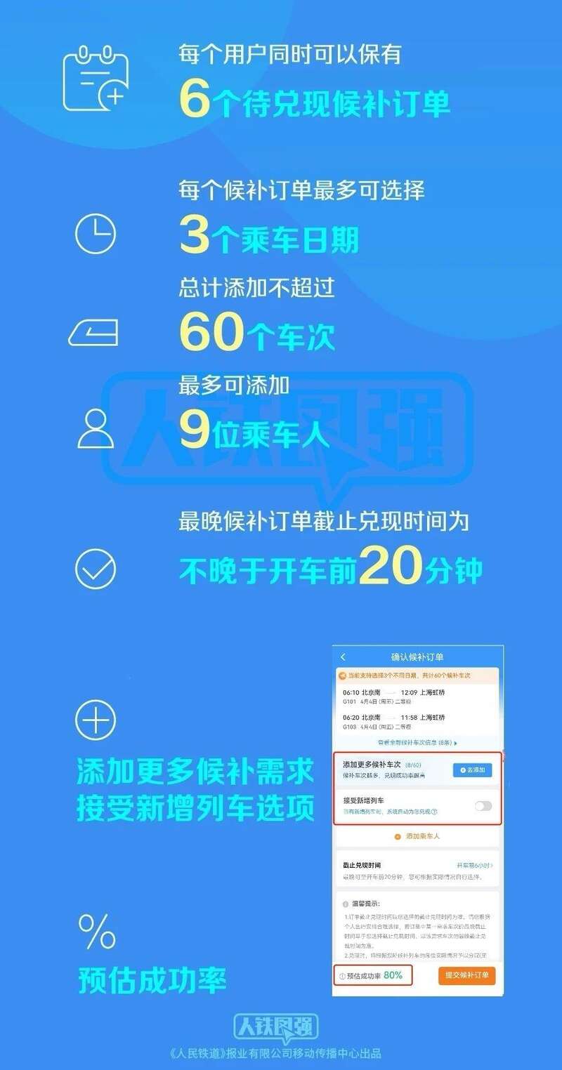 每个用户同时可以保有6个待兑现候补订单;每个候补订单最多可选择3个乘车日期,总计添加不超过60个车次;最多可添加9位乘车人;候补订单截止兑现时间为不晚于开车前20分钟。