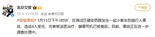 央视网消息:北京交警发布警情通报:5月15日下午3时许,在海淀区健安西路发生一起小客车刮碰行人事故,造成4人受伤,伤者被送医治疗,肇事司机已被查获。目前,事故正在进一步调查处理中。