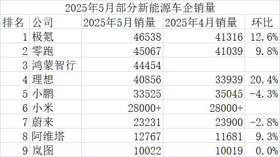 极氪、零跑、鸿蒙智行和理想以超过4万辆的数据站在头部。极氪科技5月销量46538辆,同比增长15.2%,环比增长12.6%,连续三个月月销超4万辆。鸿蒙智行全系交付新车44454辆,再创新高。两家公司均在月报中强调了高端市场的定位。