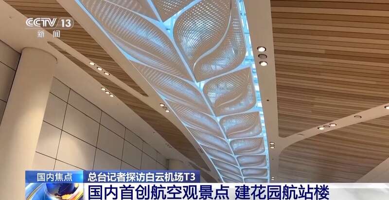 总台记者 吴媚苗:走进航站楼,随处可见新鲜的鲜花绿植的景观,不愧是“花城”广州的机场。多类花园景观的总面积达到了近1万平方米,规模是国内机场之最。值机大厅内采用一排排像花冠一样的主柱,支撑起主楼的屋盖钢结构,办票岛台创新设计成花的形状,玻璃穹顶则呈花蕾型,整个大厅以花为主题。