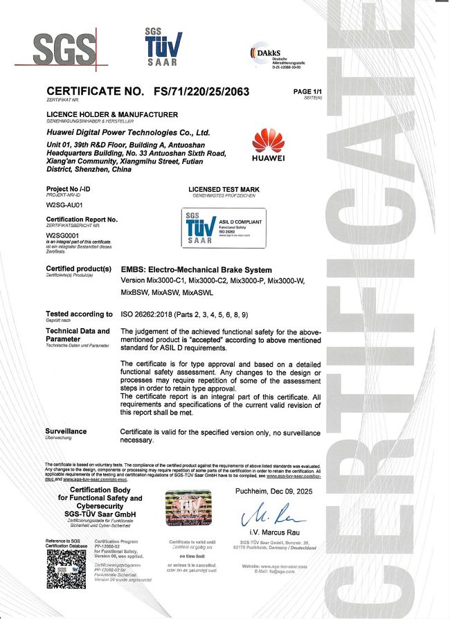 【中国,深圳,2025年12月15日】国际权威认证机构SGS通标标准技术服务有限公司正式向华为颁发融合驱动全球首个ISO 26262 DAkkS ASIL D等级认证证书。这一突破性成果,标志着华为自主研发的首款华为DriveONE融合驱动产品,已达到汽车功能安全领域的国际最高标准,为消费者的每一次出行筑牢“安全防线”。