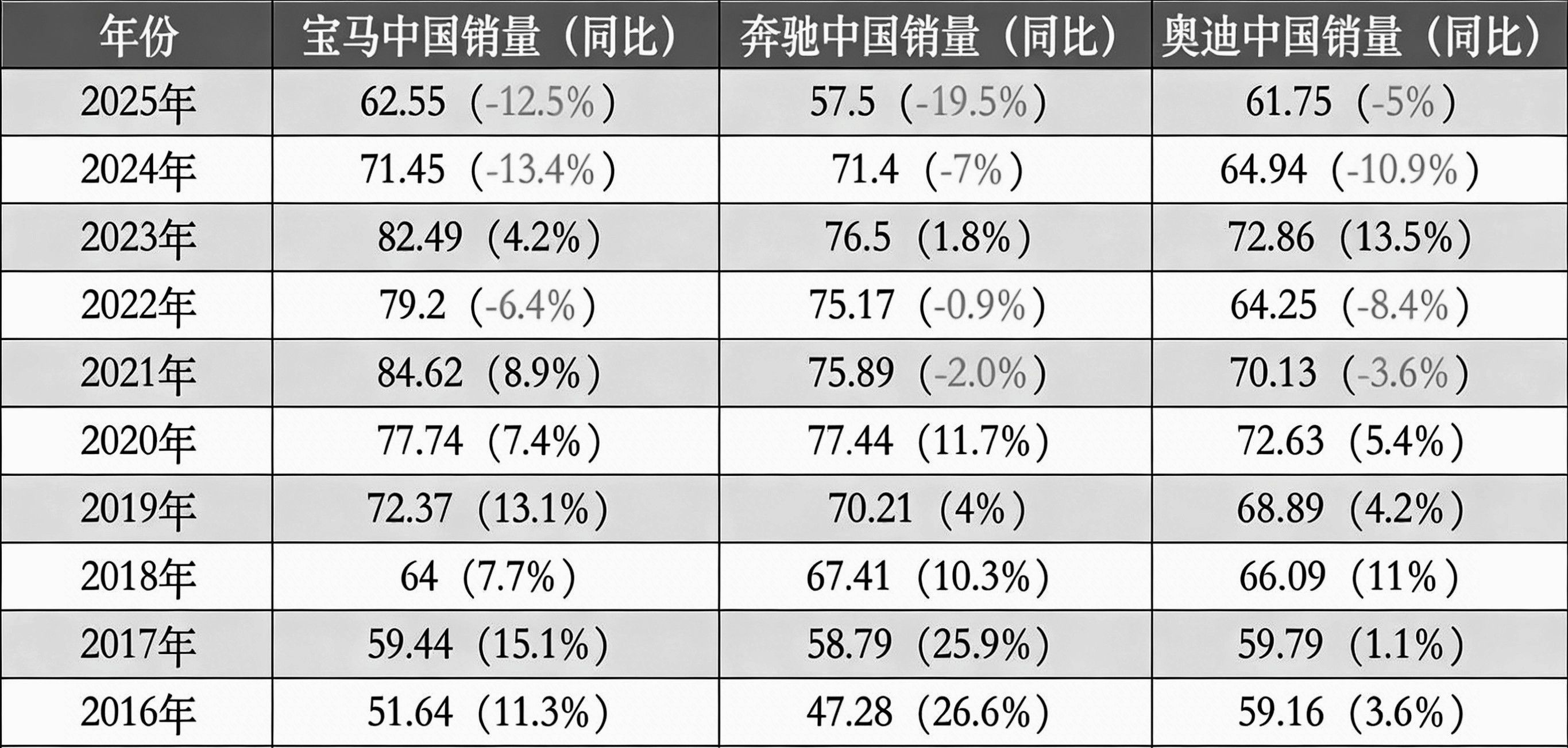 上述数据显示,2025年,BBA中国市场销量水平回到了七八年前。